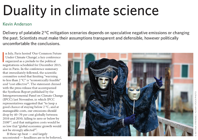 In most Integrated Assessment Models, 2 °C carbon budgets are effectively increased through the adoption of negative-emission technologies. These technologies are currently at little more than a conceptual stage of development, yet are ubiquitous within 2 °C scenarios. Nowhere is this more evident than in the IPCC’s scenario database. Of the 400 scenarios that have a 50% or better chance of no more than 2 °C warming (with three scenarios removed due to incomplete data), 344 assume the successful and large-scale uptake of negative-emission technologies. Even more worryingly, in all 56 scenarios without negative emissions, global emissions peak around 2010, which is contrary to available emissions data.