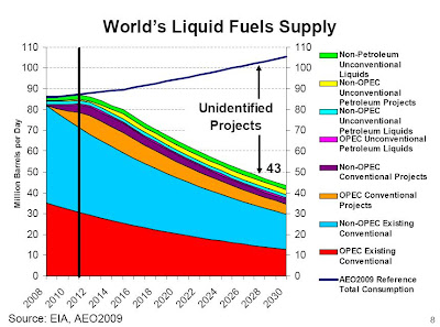 Compare these forecasts to a forecast based on much sounder data, this one made by an EIA researcher in 2009 about how much oil we would have to find and deliver to meet rather extravagant future demand expectations: