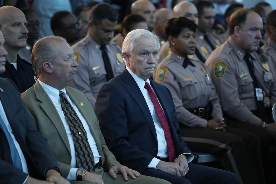This week, Attorney General Jeff Sessions outlined plans to transfer heavy military weapons to local police across America. (Photo by Joe Raedle/Getty Images – taken before Miami press conference on sanctuary cities.)