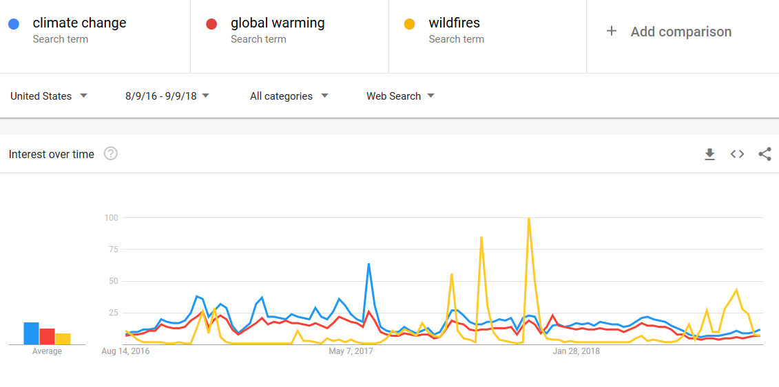 Alas, that’s not true. The results are stark clear: there is NO evidence of an increased public interest in global warming as a result of the fires. Here are the results of a search on Google Trends for the United States, these data record the number of times that a certain term was searched on the Google Search Engine.