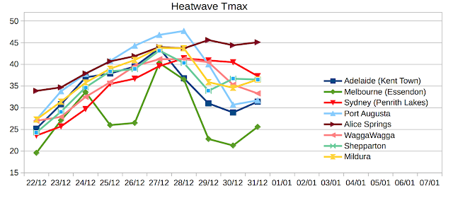 - December 29 – Slow roasting Australia, Cruel increase in night time temps in Albury, warning about taking fur buddies for a walk, Thongs and roads melting in Sydney while NSW inland records fall, Heat in Canberra, Alice Springs sets all time heat record, historical heat deaths stats, New extreme heat policy by Tennis Australia, AMA on heathealth Safety, climate scientist warning