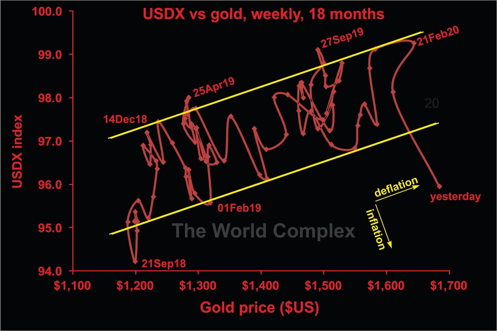 From a huge drop last Friday–which in the past would have presaged further declines the following week–to a significant rebound in the gold price, coupled this time with a major drop in the US dollar–which I will argue may be the signal for a switch to inflationary conditions.