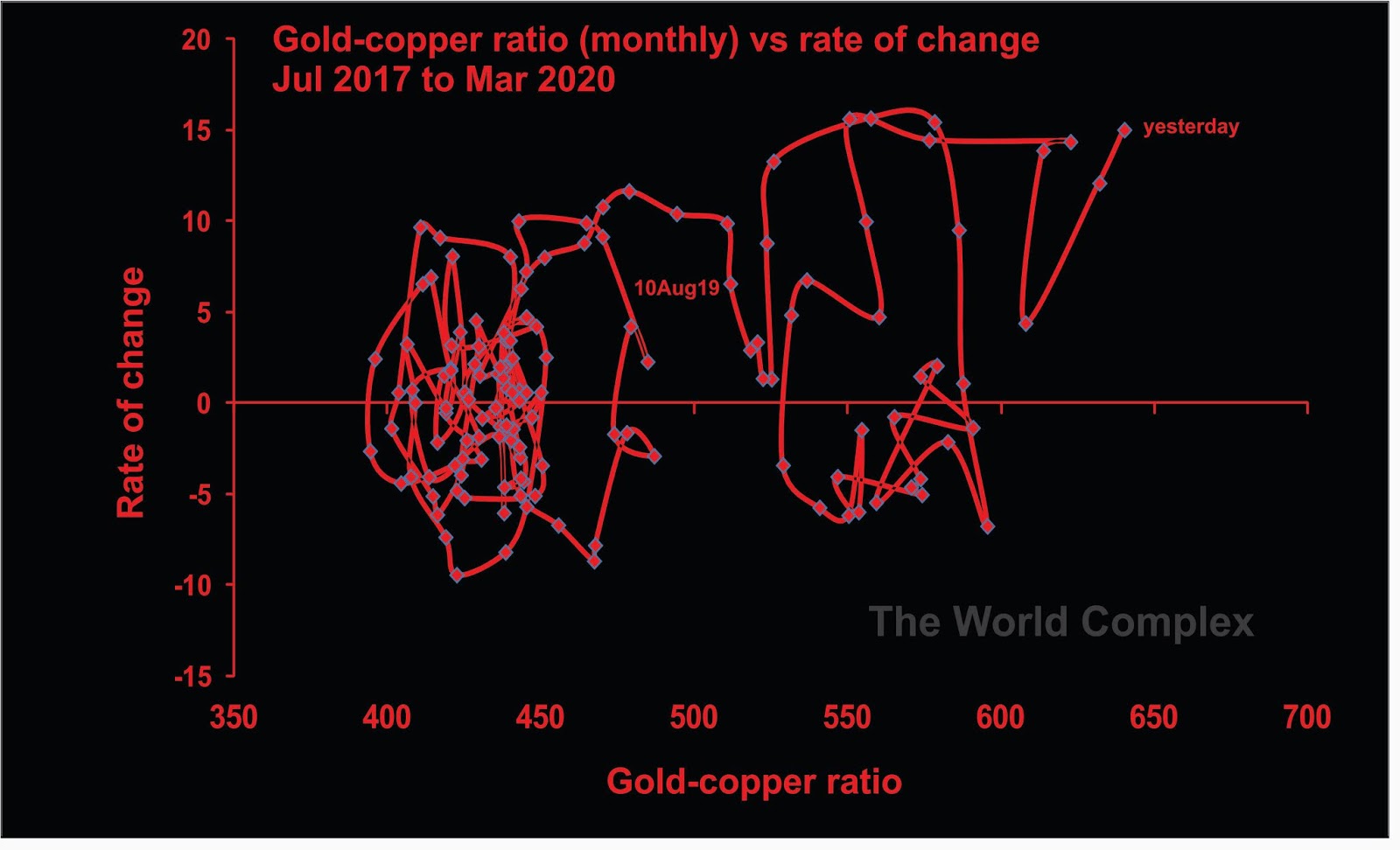 This graph plots the gold-copper ratio against its rate of change. I typically interpret this ratio as an indicator of the real world preference between bricks and mortar and financials. When the ratio is low, it’s a sign that people would rather make refrigerators than chase derivatives. Rate of change is the vertical axis. Near the top of the chart means that the plot is shifting towards the right at high speed. Currently, the system is moving toward the right (ratio is increasing) at the fastest rate in the last couple of years. To me, this means the real economy is degrading very quickly.