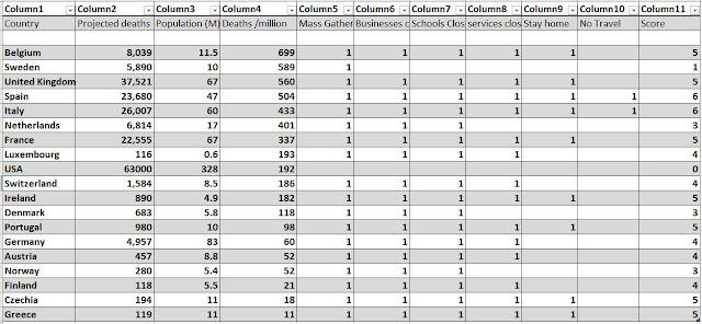 Data about the mortality of the coronavirus epidemic start being available. Above, a list of mortality rates for European countries taken from theInstitute for Health Metrics and Evaluation (IHME) of the University of Washington. It is not the complete data set, only Western Europe and the US. The data are ordered by the projected number of deaths per million inhabitants. In addition, I built a “lockdown score,” also based on the data reported by IHME (except for the US, where different states chose different options). It would be difficult to say that these data support the idea that a “hard” lockdown that includes a stay home order is more effective than a looser kind of lockdown. (for a live version of the table, write to me at ugo.bardi(whirlette)unifi.it)