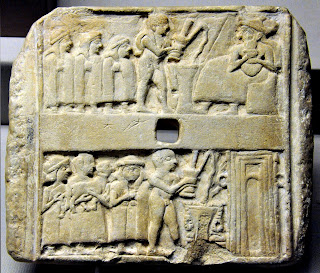 Temple worship in Ur, from Sumerian times. Note in the lower panel people are bringing all sort of goods to the temple represented as the abstract structure on the right.