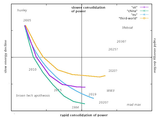 Overall, RN argues that we have moved into the scenario that Holmgren called the “Brown Tech” scenario, where the ruling elites have decided that the way to go is to concentrate all the remaining resources for their use, while the commoners are left in the cold. RN describes this scenario as “a totalitarian monster gripping power through a pervasive surveillance and police state, and the majority of the population pressed into poverty and dependence.” Enjoy this post!